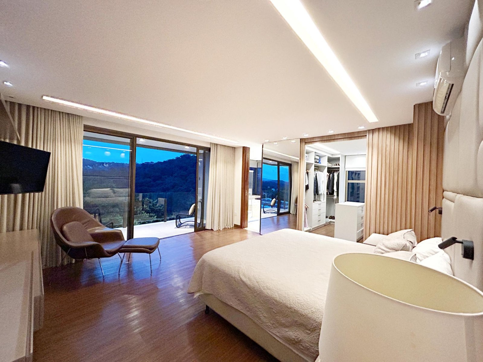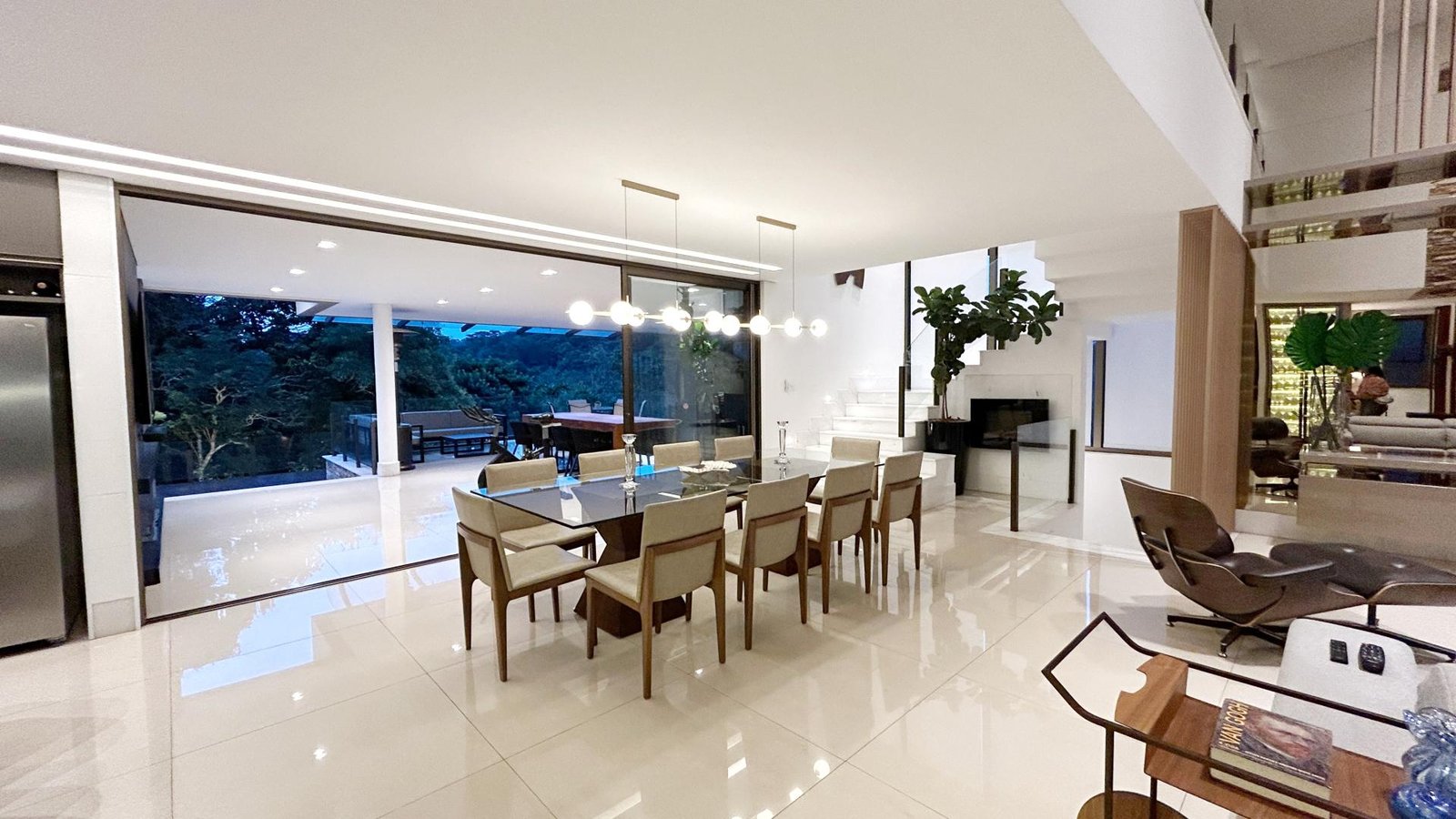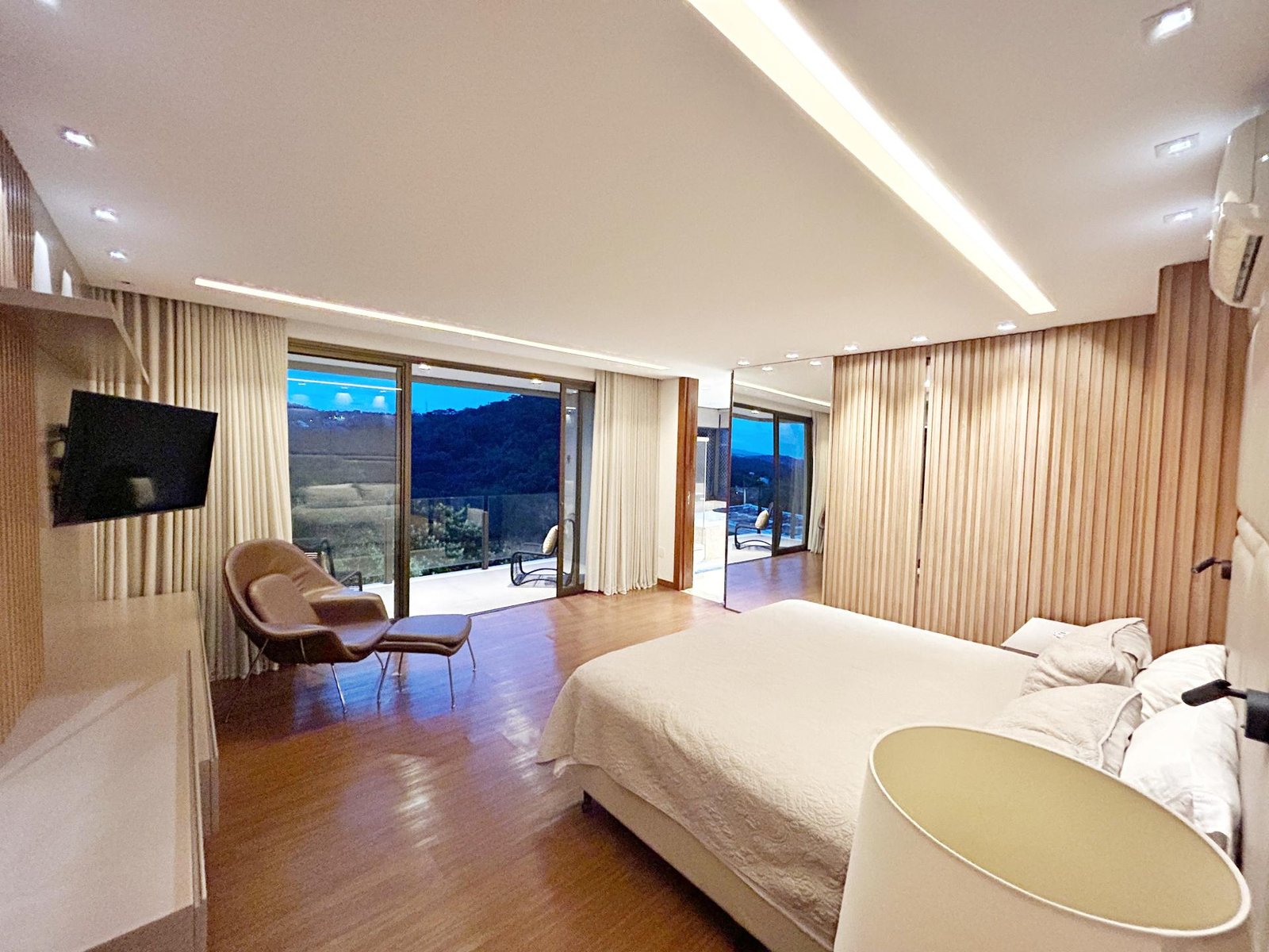 Um verdadeiro santuário dentro da cidade! Maravilhosa casa com 475m2 de área construída, lote com 1.950m2, paisagismo exuberante envolvendo todos os espaços da casa, assim como a iluminação externa, com espécies variadas, dentre elas, coqueiros, palmeiras, frutíferas e nativas da mata que margeia os fundos da casa e grande parte do condomínio. Com 3 suítes amplas com closet e varanda, suíte master com ampla varanda, banheiro com 2 duchas, cuba dupla e banheira de hidromassagem, sala com pé direito de 6 metros e amplas aberturas de vidro conjugada com cozinha e aparelho para 60.000 BTUS, lindo lavabo com bancada em travertino romano, moderna área gourmet com churrasqueira integrada com a casa, piscina grande com aquecimento solar, prainha e spa com aquecimento a gás, amplo deck e sauna. A casa possui aquecimento solar em todos os chuveiros e torneiras dos banheiros, inclusive as do lavabo, do banho da área gourmet e da cozinha, e ainda uma usina fotovoltaica instalada com 28 placas, cobrindo todo o consumo de energia. Os móveis planejados foram fornecidos em grande parte pela Linea D´oro, conferindo sofisticação, um acabamento impecável, com ferragens de alto padrão e durabilidade sem igual, persianas automatizadas na escada, rack e painel que cobre todo o pé-direito. A casa ainda possui ar condicionado em todas as 3 suítes e no escritório. Todas as esquadrias são em alumínio anodizado de alto padrão, metais sanitários e louças são todos da marca Deca e 3 vagas livres cobertas. A casa fica posicionada num dos melhores pontos do condomínio, trazendo total integração com a mata e uma vista definitiva dos principais cômodos, um imóvel exclusivo com total privacidade, vista definitiva para a mata e sofisticação.
